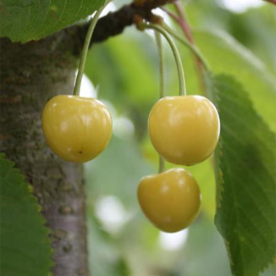 • Caractéristiques visuelles : Grosse cerise arrondie. Elle est jaune, les fruits ont parfois une joue pâle rose orangé.