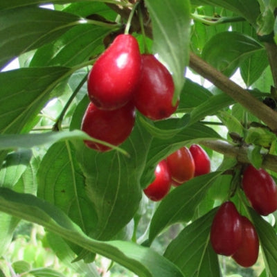 Le cornouiller à gros fruits, souvent méconnu, a pourtant des atouts incroyables pour votre forêt comestible. En effet, le cornouiller est très productif, très résistant au froid, et aux maladies. Il supporte très bien la taille et peut être implanté en haie, il est également très mellifère. La présence d'au moins deux cultivars différents plantés assez proches (moins de 6 mètres) est nécessaire pour la pollinisation croisée et favorise également une production abondante. A pleine maturité le fruit est délicieux, bien sucré. Riche en vitamine C, anti-oxydants, sucres, acides de fruits, pectines et anthocyane. Pour faciliter la récolte, on préconise de mettre des filets pour les arbustes pour récupérer les fruits murs, que l'on peut ensuite manger en frais, transformer ou congeler pour une transformation ultérieure.