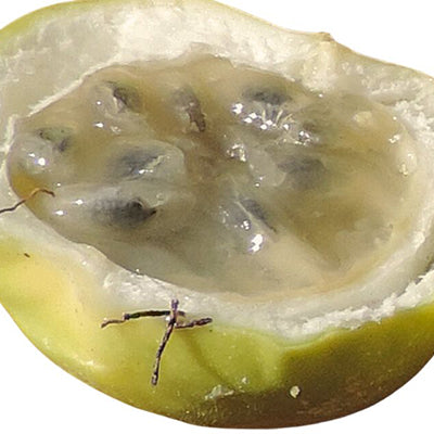 • Caractéristiques visuelles : Le fruit est petit pour un fruit de la passion (3 à 4cm de diamètre), vert clair à maturité. La pulpe est juteuse, sucrée, acidulée, extrêmement parfumée, délicieuse.