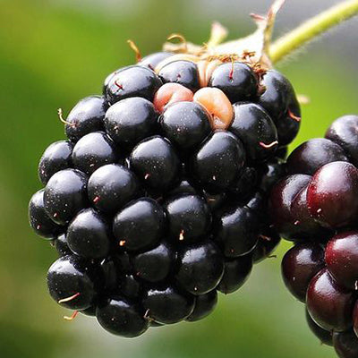 Le Mûrier 'Black Satin' qui est une ronce fruitière arbustive grimpante produit de gros fruits noirs à maturité. La saveur est douce et parfumée.